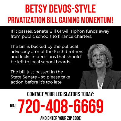 The union isn’t the only group using DeVos’s image to oppose legislation making its way through the statehouse. A new political nonprofit, Colorado Children Before Profits, launched its own website linking DeVos and President Donald Trump to the charter school funding bill, and two other bills that would change the way Colorado funds schools.