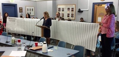 Sonja Semion, who heads Stand for Children Colorado, brought along a unique visual aid to show that group’s support for the standards – a printout containing more than 7,000 signatures from citizens who signed a Stand online petition supporting the standards.