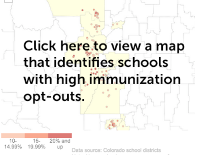 Explore this map by hovering your cursor over dots to see school names and exemption rates. The map highlights the more than 140 Colorado schools in the state’s 20 largest districts that have enough students opting out of immunizations to potentially compromise herd immunity and hasten the spread of communicable diseases.
