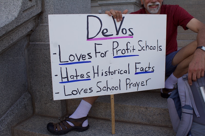 Those are some of the hundreds of colorful signs demonstrators carried at the Capitol Wednesday to protest U.S. Education Secretary Betsy DeVos’ scheduled Denver visit.