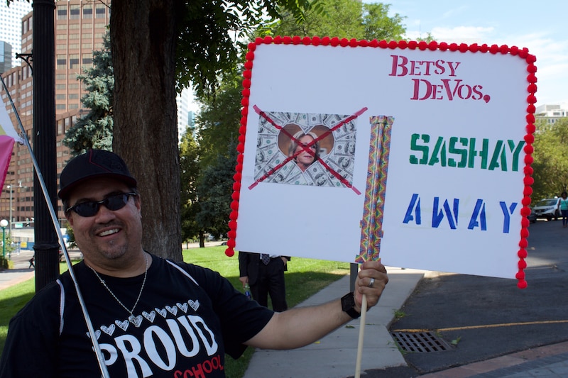 Denver Public Schools teacher Michael Durga waited calmly outside the Capitol for the protest to start Wednesday morning. Donning a T-shirt that read “Proud public school teacher,” Durga carried a colorful flag urging support for public schools and a sign themed after the reality show RuPaul’s Drag Race. “DeVos is a nightmare,” he exclaimed. “I want her to know that I am opposed to everything she stands for.”
