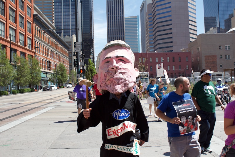 The man behind the Neil Gorsuch mask is Ian Kolsky, a DPS teacher. Kolsky and four others dressed as Republican-appointed Supreme Court justices. The demonstrators belong to a group called Move to Amend, which calls for a constitutional amendment limiting the rights of corporations.