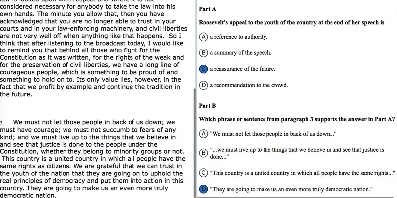And finally, questions might have more than one part, where students must reference specific parts of the text to get the correct answer.