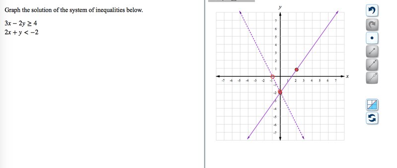 The most complicated sample question asks students to graph equations on the screen. To get the answer, students have to first solve each equation, then show the answer on the graph using the correct lines and points. Placing the points can be a little tricky, but clicking a line button automatically connects two points — no freehand lines need to be drawn.