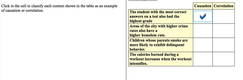 Students also will have to use charts to prove they understand the difference between terms, such as in this example testing if they understand the difference between causation, data that shows one action causes another, and correlation, which simply shows two actions are connected but one might not cause the other.
