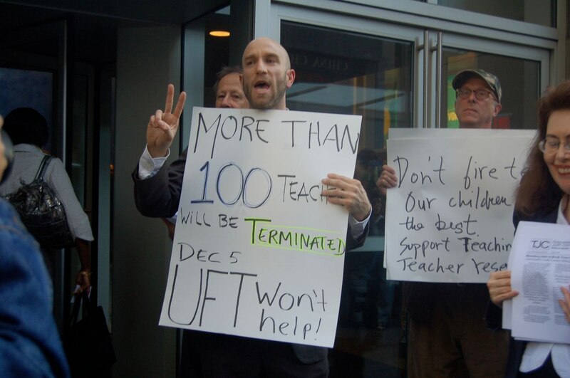 The union has been working hard to help ATR members — even filing an age discrimination lawsuit on their behalf this spring — but the teaching fellows cause has been left more untouched. So about a dozen or so of them protested Wednesday outside the UFT’s delegate assembly meeting, trying to get support. In doing so, they stood side by side with the ATR teachers.