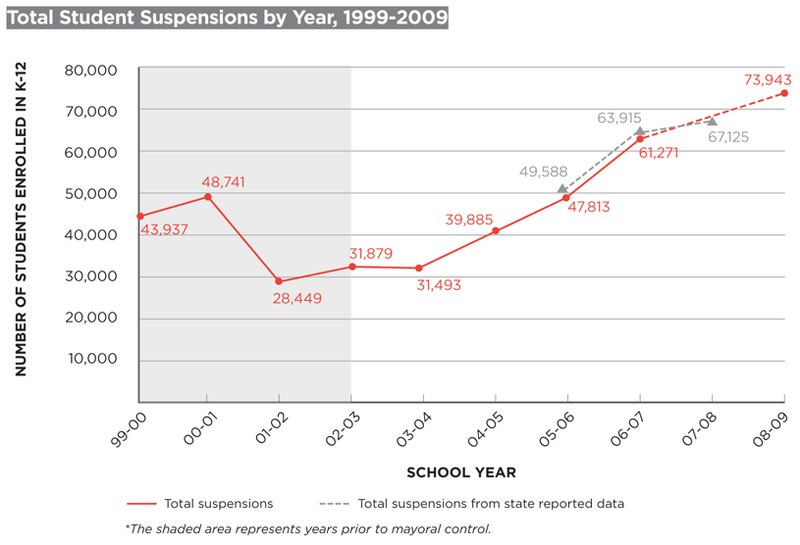 The NYCLU’s report concludes that the spike in suspension rates over the years is connected to changes in the city’s discipline code, which now categorizes more infractions as being suspension-worthy than it did a decade ago. It also notes that the police presence in schools has increased since 2002, when former Chancellor Joel Klein started Operations Safe Schools.