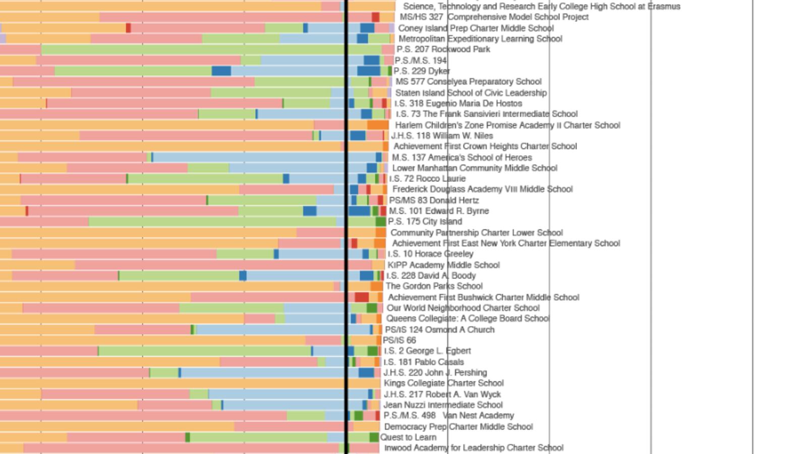 Those following the conversation won’t be shocked to learn that 60 percent of seventh-graders who went on to the elite schools in 2014-15 came from just 45 middle schools. But the other end of the spectrum is arguably more striking. Only two-tenths of a percent of seventh-graders, or nine students, who went on to specialized schools came from the city’s lowest-performing 124 schools.