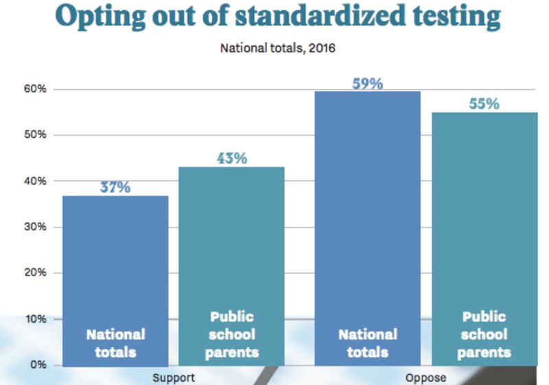 4. Fifty-five percent of public school parents oppose allowing children to sit out standardized tests. Overall, the demographic groups most opposed to the opt-out movement are black people (67 percent) and senior citizens (68 percent).