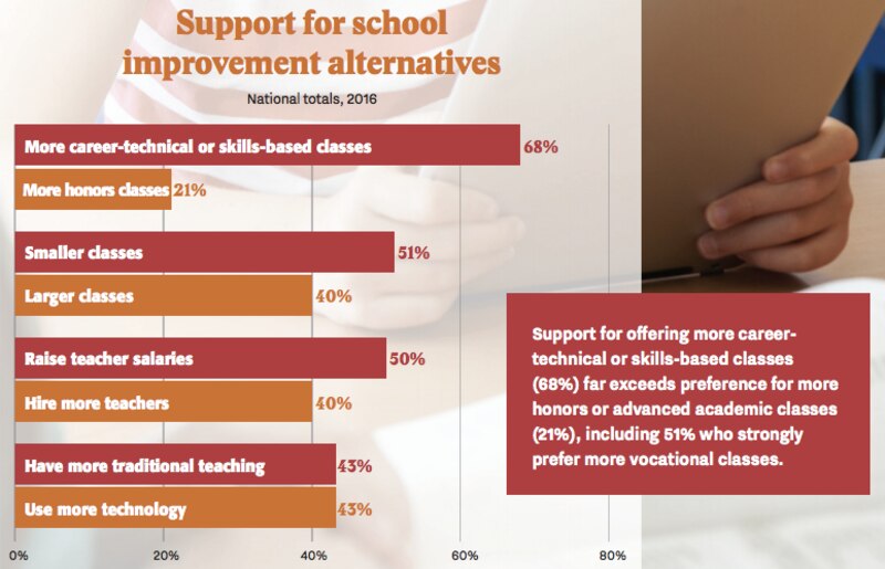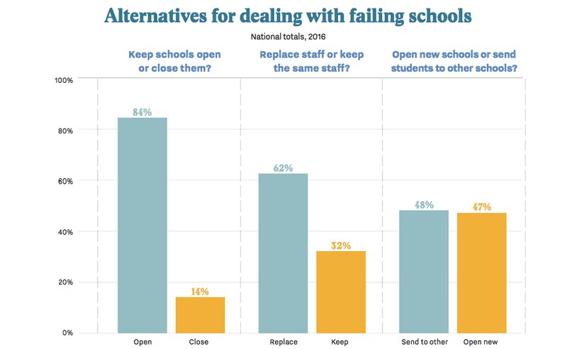 Americans are overwhelmingly against closing struggling schools, divided on whether parents should be allowed to opt their kids out of standardized tests, and more enthusiastic about expanding career and technical education than honors classes.