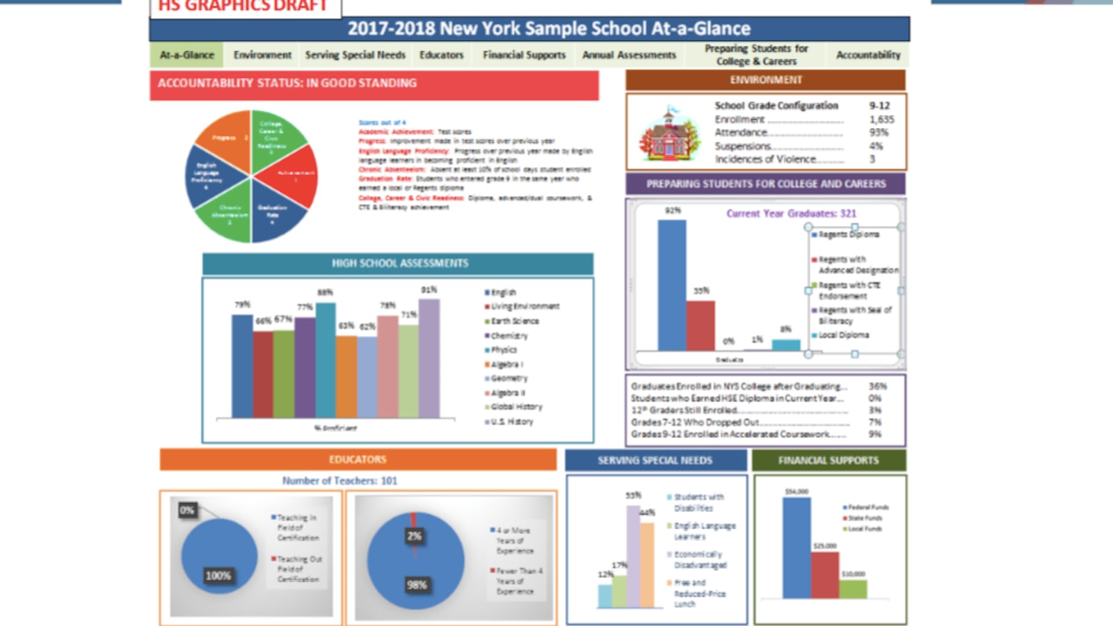 The colorful pages released Monday by New York state officials are an illustration of how the state could display information about schools to the public. Creating a “dashboard” is part of the state’s broad rethinking of what it means to be a successful school under the new federal education law.