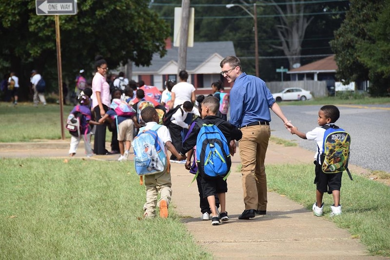 Teacher Carl Schneider walks children home as part of the after-school walking program at Whitney Achievement Elementary School. (Chris Hill/Whitney Achievement School)