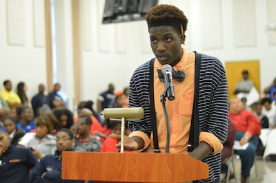 Samone Nelson, 17, a junior at North Side High, asks the board to “leave our school open.” (Micaela Watts)