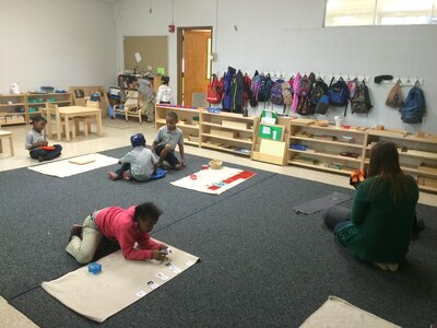 1:45 p.m. The classroom has carpet in the center and no desks. Around the room’s perimeter are stations for various subjects with materials that students pull from to work on their own small floor mats around the room.