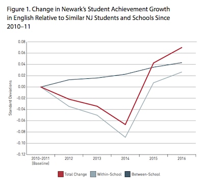 “By the fifth year of reform, Newark saw statistically significant gains in English and no significant change in math achievement growth,” the researchers conclude. “Perhaps due to the disruptive nature of the reforms, growth declined initially before rebounding in recent years.”