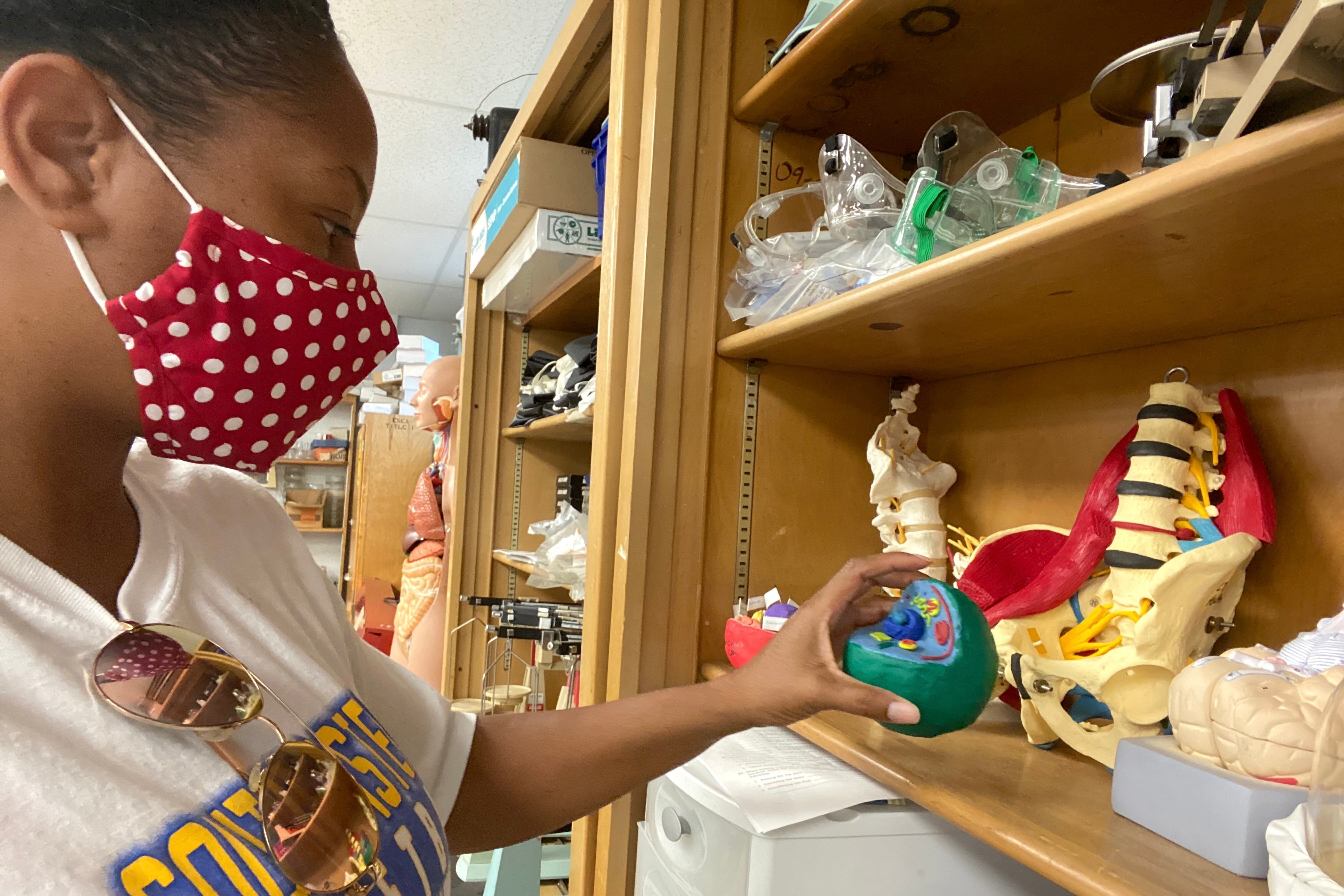 That’s all about to change. Starting Monday, she’s teaching seven classes virtually, mostly biology and human anatomy. She’ll be armed with over a month’s worth of virtual teacher training. And she’ll be set up in her lab at school, model skeletons and all.