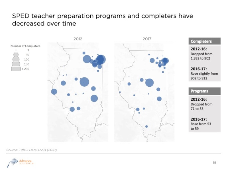 From 2012 to 2016 the number of special education teacher prep programs in Illinois dropped 25%; the number of bilingual education programs for aspiring teachers fell by half. The number of graduates from each specialty program likewise plummeted.
