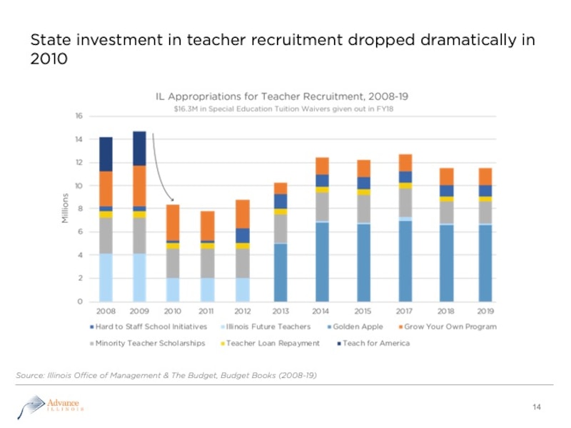 The decline is due in part to state disinvestment in that time period, Whalen said. According to information from the Illinois Office of Management, spending on teacher recruitment and financial assistance programs, including the Illinois Teacher Loan Repayment Program, Golden Apple tuition assistance and scholarship program, and minority teacher scholarships, has shrunk by more than $3 million since 2008.