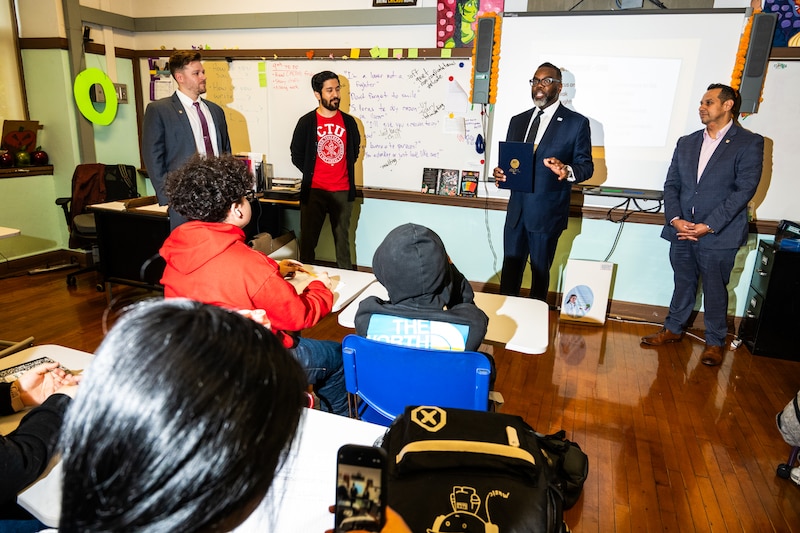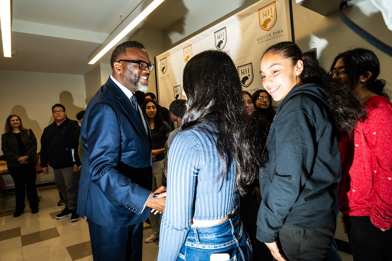On a recent Tuesday morning, Mayor Brandon Johnson visited classrooms at Kelvyn Park High School in Hermosa to present certificates of recognition to teachers for Teacher Appreciation Week.