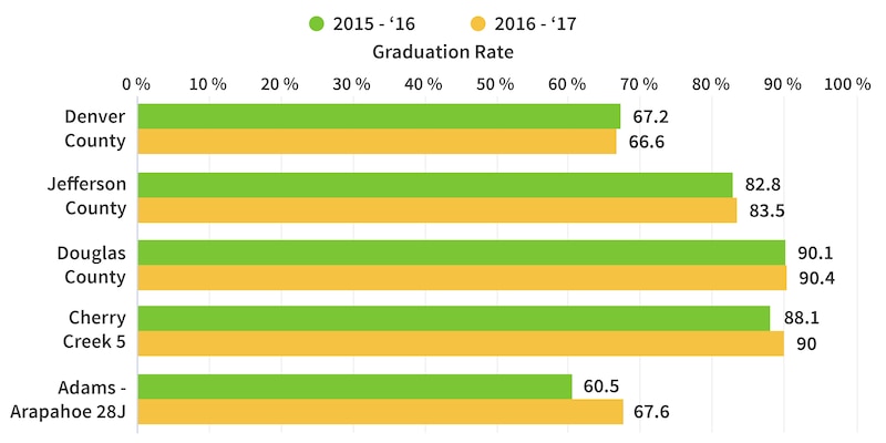 Aurora Public Schools, another large district, has shown increases in both on-time and five-year or six-year graduation rates. The district, which posted one of the highest increases among metro area districts in graduation rates last year, had a relatively large increase again in 2017.