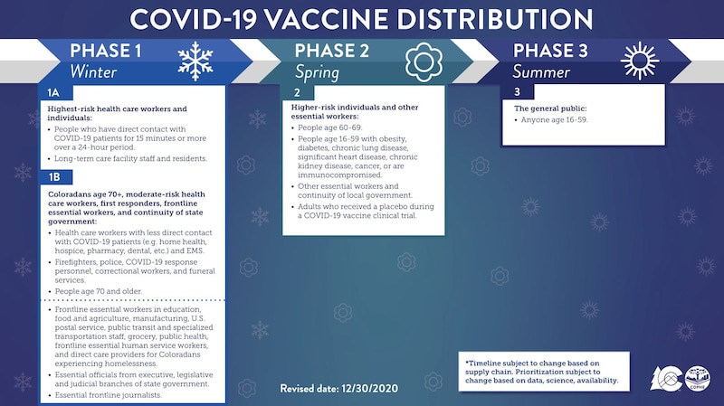 Colorado has created three priority levels for administering vaccines, with two groups, 1A and 1B, within the first. Phase 1B, which includes teachers, also includes health care workers who don’t work directly with COVID patients, first responders, people 70 and older, and some essential workers. State officials estimate that more than 1 million people fall into this category.