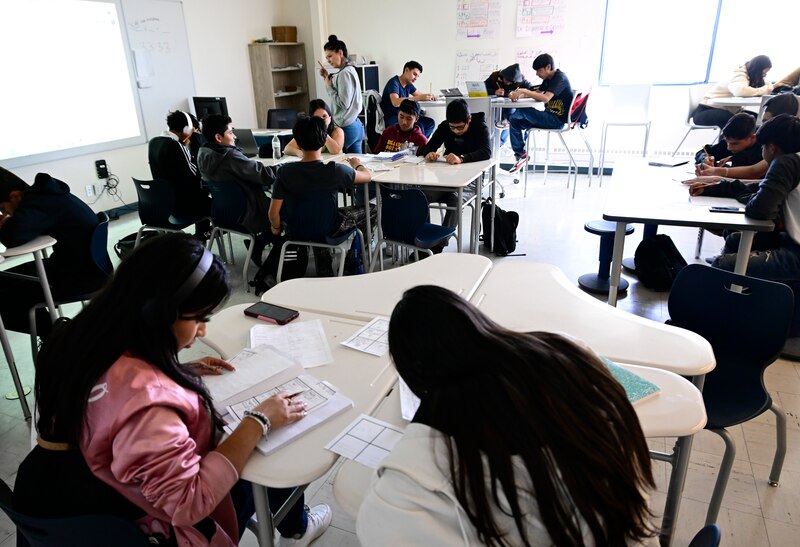 Un reciente viernes por la tarde, alrededor de 23 estudiantes de diferentes grados estaban tomando un examen de matemáticas sobre exponentes en el centro para recién llegados de Thornton High School.