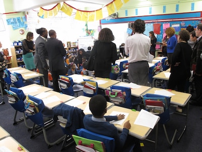 “I usually sit back and let the teacher go through the lesson and then we conversate after,” said Lynn Staton, who has served as the principal of P.S. 36 in southeastern Queens for nine years. “But I do see the value of standing next to the teacher and moving along with them.”
