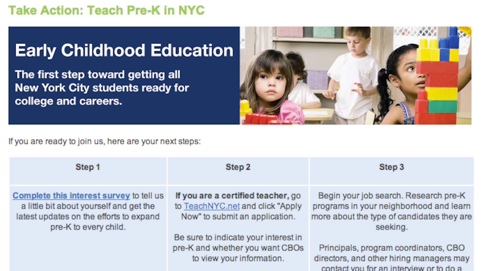 The website is a one-stop shop for the educators that officials are hoping will flock to the new programs, and is an attempt to help streamline the application process for prospective teachers. Until recently, pre-K teachers were only targeted by the Department of Education’s centralized hiring site and had to reach out to CBOs separately.
