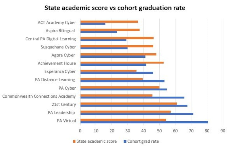 At the same time, 21st Century Cyber had the third highest graduation rate (68 percent) and the highest academic rating (61).