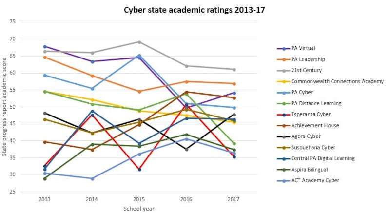 Esperanza Cyber, for instance, has the lowest academic rating (35), but a typical graduation rate for a Pennsylvania cyber (46 percent).