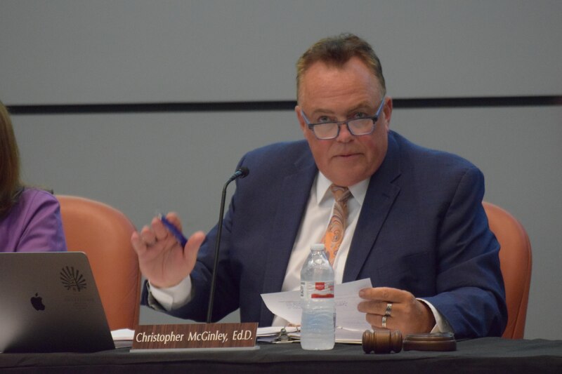 School board member Chris McGinley speaks at the first hearing of the new board in July 2018 (Photo: Greg Windle)