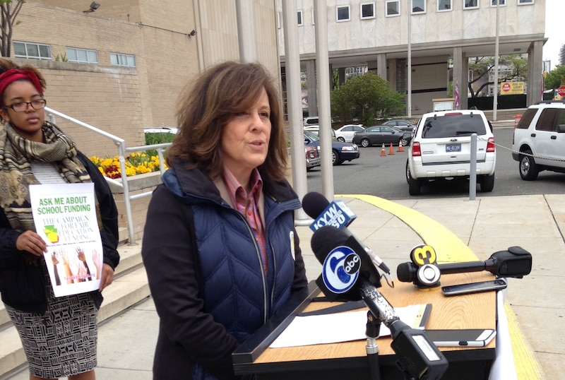 Donna Cooper speaks at a press conference outside school district headquarters.