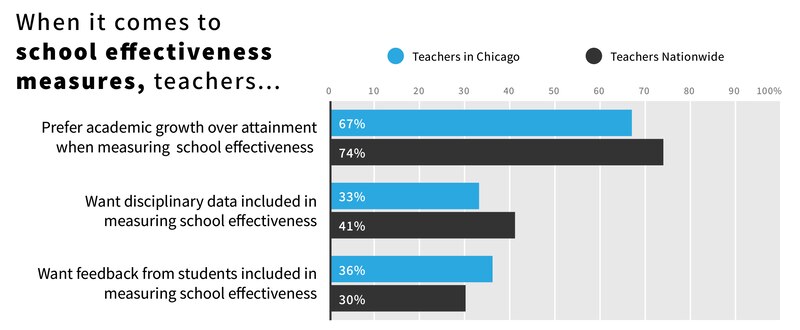 On ways to measure school effectiveness, 67 percent of Chicago teachers prefer using academic growth, compared with 74 percent of teachers nationwide. Both locally and nationally, teachers also want school culture and climate, such as disciplinary data and feedback from students, included in measures of school effectiveness.
