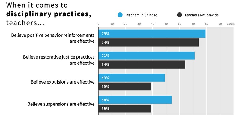 Still, 49 percent of Chicago teachers believe in the effectiveness of expulsions and 54 percent support suspensions. Both surpass the 39 percent of teachers nationally who support each of those two punitive measures.
