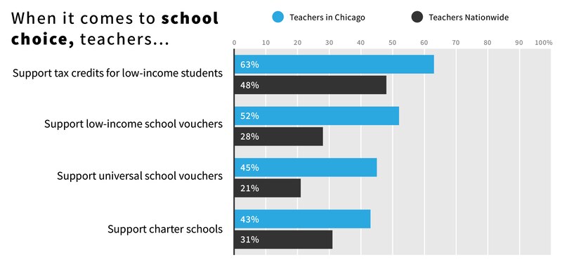 40 percent of Chicago teachers support school choice in the form of universal school vouchers, compared with 21 percent of teachers nationwide. But Chicago teachers condition their support on charter schools being equally accessible and not shifting funds away from district schools.