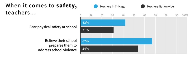 While 31 percent of teachers nationwide fear for their safety in school, the proportion was 42 percent in Chicago. At the same time 67 percent of Chicago educators said they feel their school has prepared them to address school violence, surpassing 54 percent of teachers nationwide. The top three ways teachers nationwide say they may feel unsafe are gun violence, in-person bullying, and fighting among students.