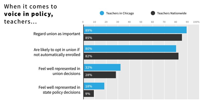Chicago teachers and teachers nationwide overwhelmingly believe in their unions, 89 percent and 85 percent respectively, and would opt in their union if not automatically enrolled, 80 percent and 82 percent respectively. But only 32 percent in Chicago and 28 percent nationally feel well represented by their unions.