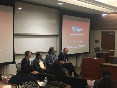 Sarah Duncan, left, of the Network for College Success, moderates a panel on grades at a conference Oct. 11, on findings of the To & Through Project. Also appearing on the panel at the University of Chicago are Juan Carlos Ocon, Chad Adams, and Wayne Bevis. (Cassie Walker Burke / Chalkbeat)