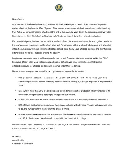 The letter said the decision was “for personal reasons” but didn’t describe the exact circumstances behind Milkie’s sudden departure, and Noble leaders weren’t reachable for comment Tuesday.