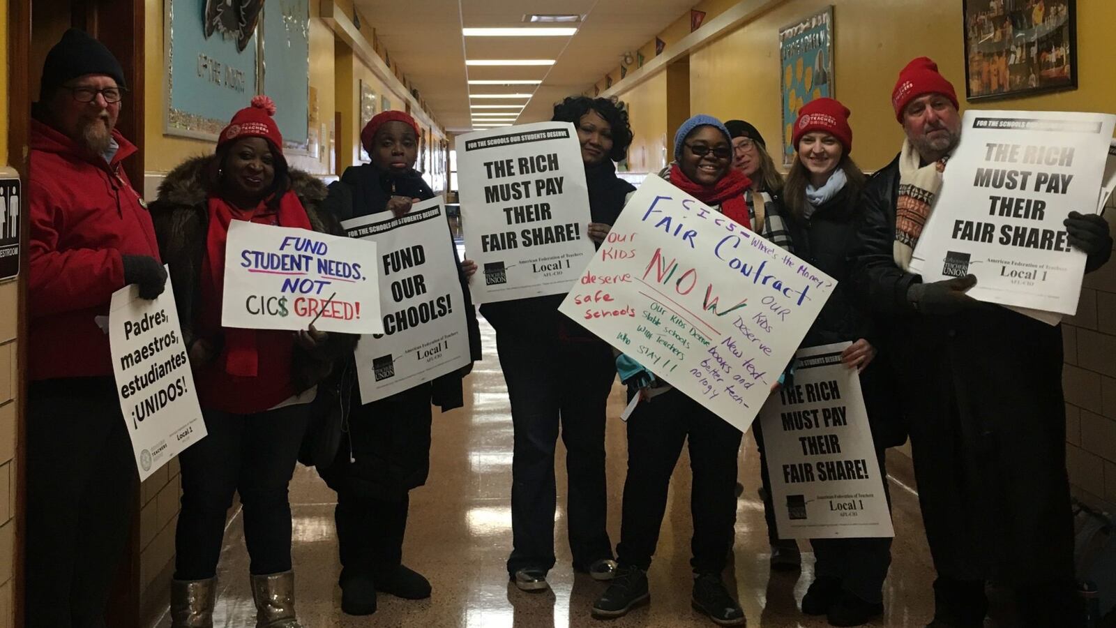 At the quiet campus of CICS Wrightwood Elementary in Ashburn on Friday morning, a staff training day, teachers clustered near brightly colored walls and banners announcing National School Choice Week — an initiative promoting charter and alternative schools. They held signs saying “the rich must pay their fair share.”