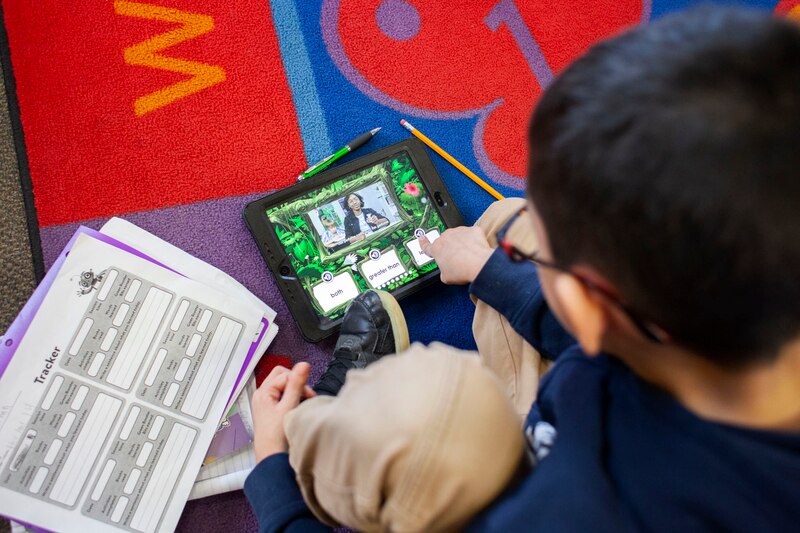 Nearby, their classmates reclined on beanbag chairs or sat on brightly colored carpets, quietly doing history or science lessons on iPads. Pollack may not have had her eye on them, but her laptop was recording each one’s progress and tally of correct answers.
