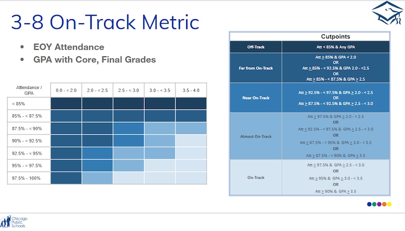 The more classes they attend, the lower the required GPA to stay on track. So for instance, students are on track if they attend at least 90% of school days and maintain a 3.5 GPA. But if they attend 97.5 % of school days, they’ll be considered on track if they have at least a 2.5 GPA. Students are considered off track regardless of their GPA if they have below 85% attendance.
