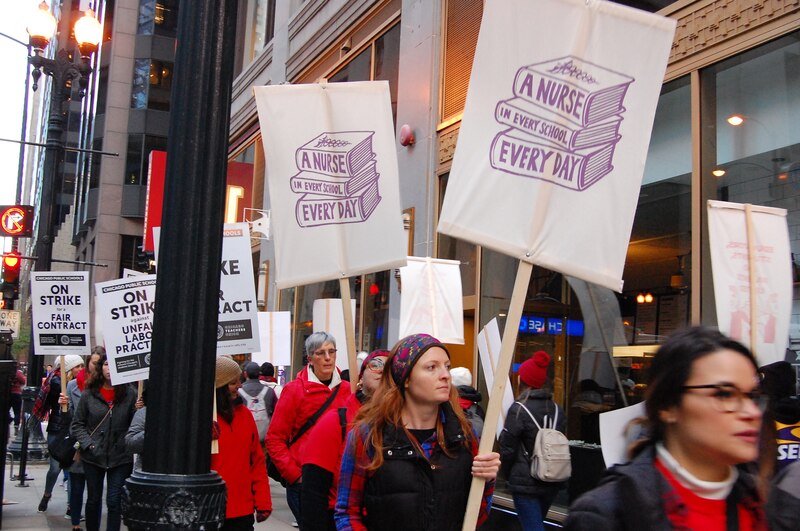 Carol Reilly was one of the certified school nurses picketing downtown. Reilly said she’s split between five elementary schools on the North Side of the city. Her duties involve everything from developing Individual Education Programs for students with special needs to helping students use inhalers, read food labels, and cope with seizures and asthma attacks. “It’s hard because you’re not seeing the children every day, so you’re not seeing if there is a health decline or you’re not seeing if they’re not coming and using their inhaler daily or you’re not able to make sure that they’re making the right choices regarding food if they have a food allergy,” Reilly said. Nurses have been a crucial bargaining point not just in Chicago, but also in Los Angeles and Boston, where teachers won higher staffing levels of these staff in their contract negotiations earlier this year. Reilly said if the Chicago teachers and other school staff were able to get more nurses guaranteed in their contract, it would make a big difference in her job because she’d be able to see students more often, address their health needs on a daily basis, and follow up more quickly with other staff and parents. “Nurses are spread so thin and nurses’ responsibilities, unfortunately, have been put on clerks and other staff,” Reilly said, adding that other staff have been tasked with things like giving out daily medication for students. “It’s obviously something that needs medical training to do. And I think it’s getting difficult for other people to confidently do these tasks.”