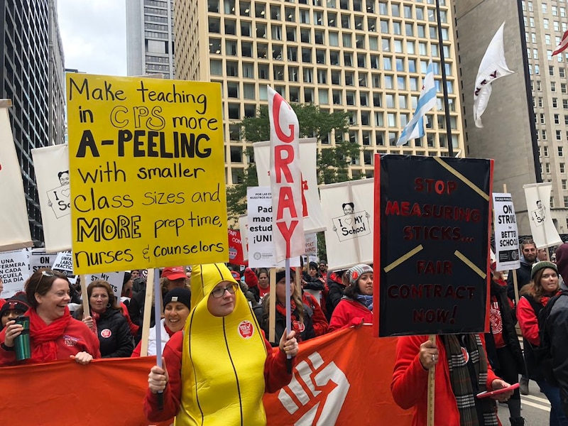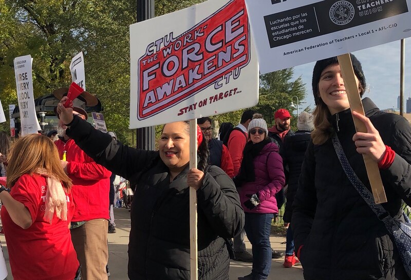 Ariel stopped by Benito Juarez Community Academy, a high school in Pilsen, where teachers are still smiling after hours on the picket line. One had an especially attention-grabbing handmade sign.