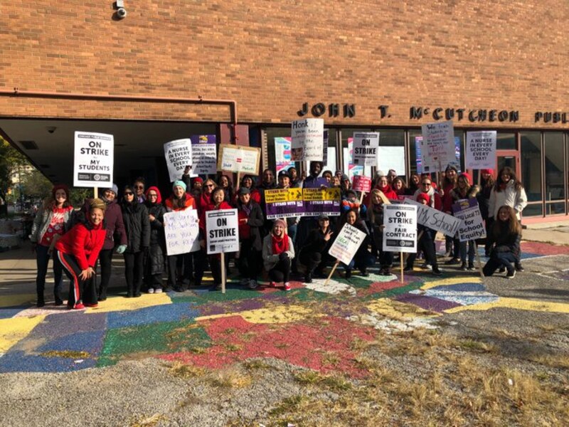 State report card data shows a homeless population of 16%, but the counselor there, Katie Malcolm, said that the number of students in “temporary living situations” is 20 to 30% at any given point. Malcolm is trained to help those students — in addition to her other counseling duties — and she said several area non-profits and small businesses step up with coat drives, boot drives, and other useful assistance. But she said she lacks background in affordable housing issues and that schools like hers need to have the “ability to help families find and navigate housing and to know their rights at a shelter.” On Thursday, the union publicly surfaced a new demand: adding staff to finding housing and mental health support for homeless students. The city is offering to fund a homeless liaison position for every school with more than 90 homeless students, about 12 schools currently, but the union wants more people dedicated to the issue. Large classes, which have become a central issue in negotiations, are not an issue at McCutcheon, said two teachers there. Kindergarten teacher Tiina Villareal has 21 students in her class, while Kylie Brokenrope, a special education teacher, is one of three teachers working with 20 students in a pre-kindergarten class that has students with and without special needs. They said they were galvanized to join the picket line on the issue of more school nurses. “We have children with allergies, and asthma, who take medicines, who get cuts and scrapes on the playground — we need a nurse more than one day a week,” said Villareal. “When you are working with younger children, their needs are amplified.”