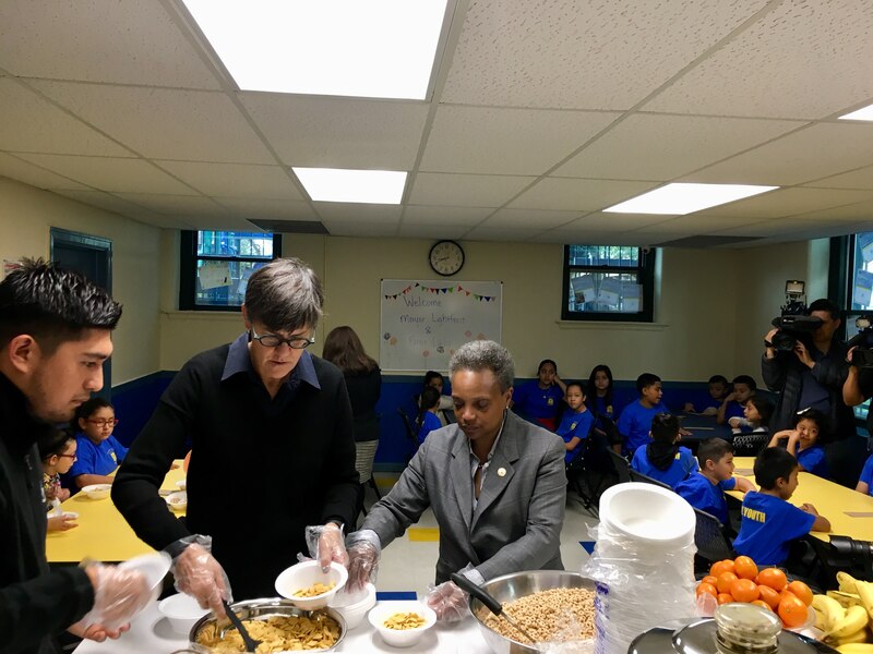 Community centers and YMCAs across the city are continuing to serve children whose classes are canceled because of the strike. Mayor Lori Lightfoot visited one of them Friday morning, Gads Hill Center in Pilsen, where she doled out Cheerios, yogurt, and bananas alongside her wife, Amy Eshleman.