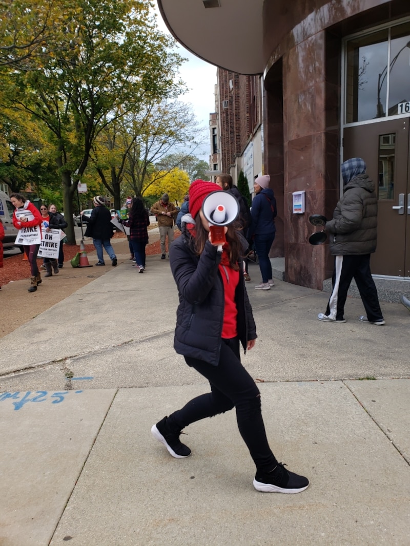 Cassie met Tessa Simonds, a middle school language arts teacher there, on the first day of the Chicago Teachers Union strike, when Passages teachers joined district teachers on picket lines. Simonds, a member of the bargaining team, said the issues at the table were teacher salaries, special education services, and the school day and school calendar. “Wages are still far below those of Chicago Public Schools,” Simonds said.
