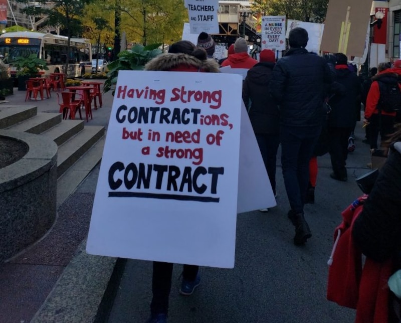 Spotted in the throng downtown: A Chicago Teachers Union member who is 37 weeks pregnant wearing a sign that says, “Having strong CONTRACTions, but in need of a strong CONTRACT.” Margot Taylor said she’s planning to stand at the edge of the rally in case she has to go to the hospital.