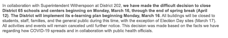 Officials say that the district will implement an e-learning plan. Other suburban districts on Chicago’s North Shore also announced closures, including New Trier and several of its elementary school feeder districts and all Northfield Township districts.