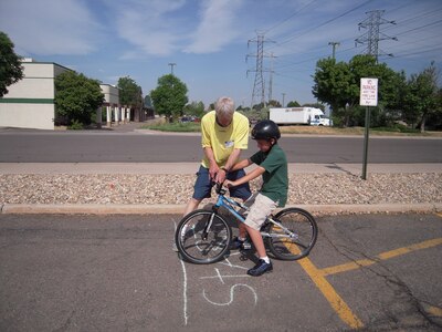 Jay Pierce, Bicycle and Pedestrian Safety Coordinator for the city of Aurora, goes over safety techniques with a bike rodeo participant. (Alan Petersime)
